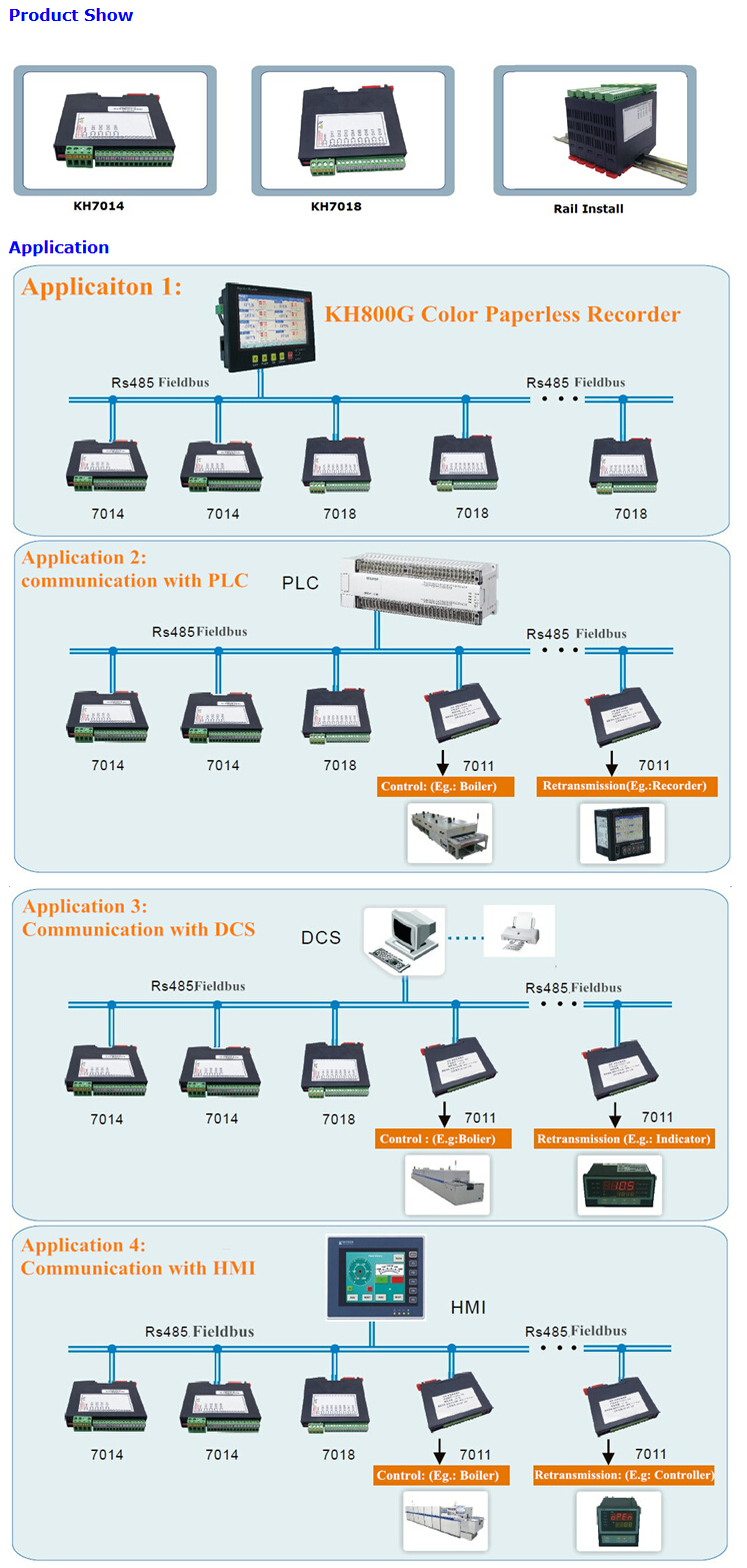 KH7014, Multi-channel analog input module, is used the advanced technology, to be designed high quality and performance, high accuracy and isolation, super thin and small size, to be aimed to log multi channels analog input signal for temperature, humidity, pressure, flow, linear voltage, linear current, battery pack etc parameters in process control field, can achieve RS485 field-bus communication based on standard MODBUS-RTU protocol in various industry application.