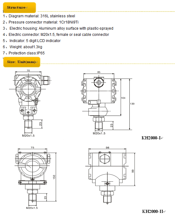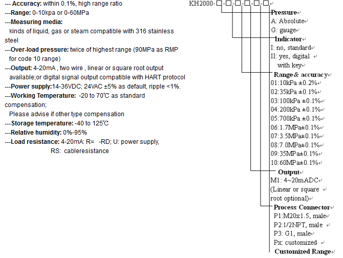 KH2000 series smart pressure transmitter adopts advanced diffused silicon sensor component of NOVA SNESOR of GE INFRASTRUCTURE SENSING and changes medium AP or GP into 4 ~ 20mADC standard signal output through high reliable intelligent circuit of HART protocol. At the same time, it can achieve HART protocol communication, check and self-testing through adding digital signal based on 4-20mA signal and accurate temperature compensation. The operation can make remote control or reconfiguration to KH2000 pressure transmitter in field site or control room. High quality sensor, exquisite seal package technology and perfect assembling process assure excellent quality and premium performance of the transmitter. KH190 has various process connection types, widely meet customer’s requirements and used in industrial fields widely.
