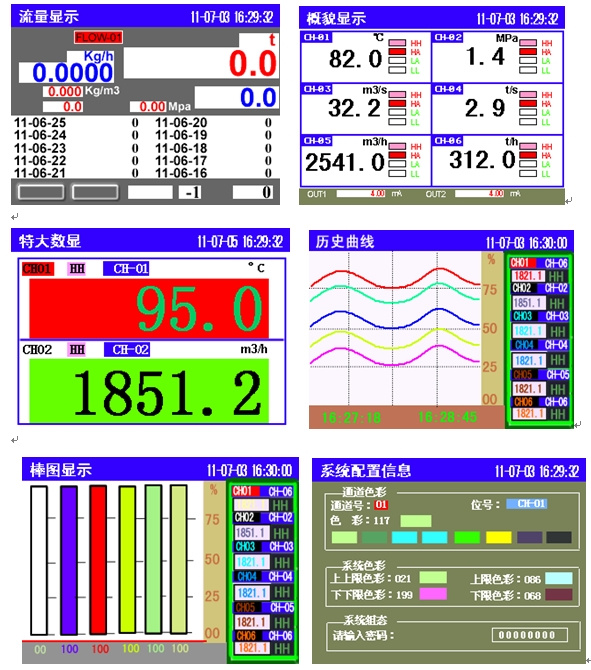 KH300AL小型彩色流量積算無紙記錄儀(96×96mm最多6通道輸入)具有全隔離輸入,可與電磁、渦街、孔板、渦輪等多種流量計(jì)配套,根據(jù)天然氣的摩爾組分,管道的溫度和壓力實(shí)時在線計(jì)算天然氣的超壓縮系,將流體流量自動補(bǔ)償為工業(yè)標(biāo)準(zhǔn)狀態(tài)(20℃、0.101325MPa)下的體積流量(智能溫壓補(bǔ)償功能)。支持多回路流量積算,數(shù)據(jù)處理、流量運(yùn)算周期小于1秒。可提供變送、通訊、打印、報(bào)警、饋電等功能,儀表具有強(qiáng)大的顯示功能,高精度棒圖顯示、實(shí)時曲線顯示、歷史曲線追憶、報(bào)警狀態(tài)顯示,同時可直接查詢年、月、日、時、分、秒的數(shù)據(jù),快捷方便。使用RS232和RS485通訊以及RS232打印,標(biāo)準(zhǔn)MODBUS-RTU協(xié)議,可與組態(tài)王、MCGS等專業(yè)軟件進(jìn)行組態(tài)。數(shù)據(jù)可直接通過任意U盤導(dǎo)出,U盤即插即讀,無需任何操作;分析軟件可導(dǎo)出EXCEL數(shù)據(jù)格式或曲線格式,直接打印即可。